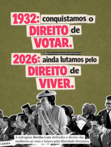Em 24 de fevereiro de 1932, nós mulheres rompemos uma barreira histórica e conquistamos o direito de votar e sermos votadas. Essa data me lembra que cada avanço veio de luta coletiva, nunca de concessão. Quase um século depois, sigo com a mesma convicção: a nossa caminhada ainda está inacabada. Se ontem reivindicávamos espaço na política, hoje seguimos reivindicando o essencial, o direito de viver. Resistiremos!
