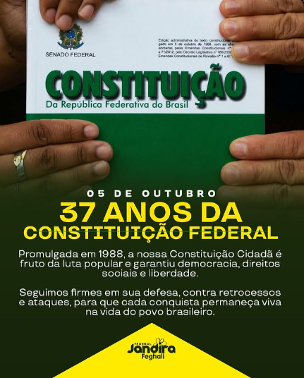A Constituição Cidadã nasceu da mobilização do povo e segue sendo instrumento de luta por justiça social, saúde, educação e igualdade. Desses 37 anos de Constituição, estou há mais de 30 no Congresso, trabalhando para defender direitos, ampliar conquistas e manter viva a essência democrática que ela representa.