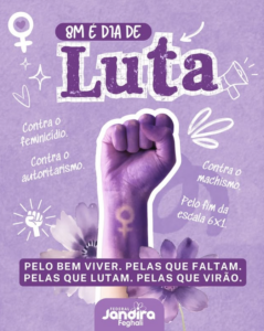 O 8 de março não é apenas uma data simbólica. É um chamado à mobilização contra o feminicídio, contra a exploração, contra o autoritarismo e opressão e contra todas as formas de violência que ainda atingem milhões de mulheres no Brasil e no mundo. Seguimos denunciando as injustiças e defendendo mudanças estruturais como mais direitos, mais proteção, igualdade e o fim de jornadas desumanas como a escala 6×1, que penaliza especialmente as trabalhadoras. Lutar pelas mulheres é lutar por democracia, dignidade e justiça social!