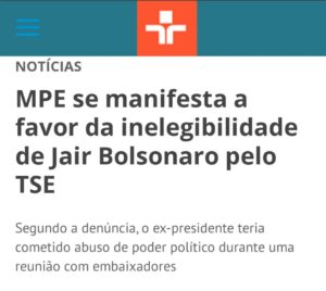 O Ministério Público Eleitoral (MPE) emitiu parecer favorável à inelegibilidade de Jair Bolsonaro pelo Tribunal Superior Eleitoral (TSE), por ter cometido abuso de poder político na desastrada reunião com embaixadores em que mentiu sobre as urnas eletrônicas. Este homem não pode permanecer na vida pública. Seu desgoverno arruinou o Brasil. Queremos Bolsonaro inelegível!