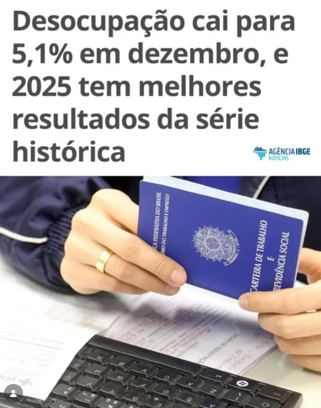 O Brasil registrou em dezembro a menor taxa de desemprego da história: 5,1%. Isso é uma visão de estado que prioriza o seu povo: toda vez que o país alcançou seus melhores números de emprego, foi com @lulaoficial na Presidência. Quando o Estado investe, a renda circula, a indústria cresce e as oportunidades aparecem. Geração de emprego não se faz do acaso, é uma decisão política. 2026 está aí e precisamos seguir avançando, com um projeto que mantenha o povo na agenda central, com um país forte, democrático e soberano!