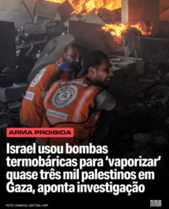 O ódio de Israel aos palestinos é absoluto. Uma denúncia da Al Jazeera relata que quase 3 mil pessoas foram literalmente “evaporadas” pelas forças israelenses com ataques de bombas termobáricas. Estas bombas geram temperaturas tão altas que incineram corpos em segundos, sem deixar quase nenhum resto identificável. Israel direciona ao povo palestino uma lógica de extermínio nazista. Horror inominável.