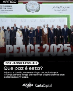 Enquanto a partilha africana foi feita em nome da “civilização”, em Gaza decide-se o futuro de um povo em nome da “paz” – mas sem a participação deste povo. O Estado Palestino é reconhecido pela maioria das nações: é preciso agora assegurar que ele exista de fato. Não podemos aceitar que o comando daquela nação seja escolhido pelos poderes que a massacraram. O povo palestino deve escolher seus governantes, seu presente e seu futuro.