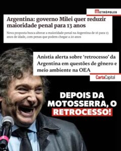 DEPOIS DA MOTOSSERRA, O RETROCESSO! O governo de extrema direita de Milei está propondo reduzir a maioridade penal para 13 anos, impondo penas severas de até 20 anos. Esta medida representa um sério retrocesso nos direitos humanos e na proteção da juventude na Argentina. Além disso, a recente manifestação da Anistia Internacional destaca a preocupação com a posição regressiva do governo argentino em questões fundamentais como gênero, meio ambiente e defesa dos direitos humanos perante a Organização dos Estados Americanos. Milei é cruel, ataca, tira direitos e afunda cada vez mais o país.