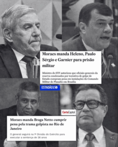 Pela primeira vez na História do Brasil, militares golpistas de alta patente foram PRESOS! Os generais Augusto Heleno e Paulo César Nogueira, artífices do golpe ao lado de Jair Bolsonaro, foram levados para o Comando Militar do Planalto, enquanto o almirante Garnier foi recolhido a instalações da Marinha, também em Brasília. Bolsonaro seguirá preso na Superintendência da PF, mas Anderson Torres cumprirá pena na Papuda. Também foi determinado o início das penas do general Braga Netto, que já se encontra preso, e do foragido Alexandre Ramagem. Uma decisão histórica do STF contra quem atentou contra a democracia brasileira!