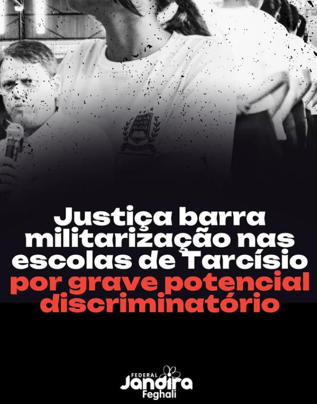 A Justiça de São Paulo acaba de impor uma derrota ao projeto autoritário de Tarcísio ao suspender as regras das escolas cívico-militares e vetar militares em sala de aula, apontando “grave potencial discriminatório” e violação à gestão democrática do ensino. O que o governo paulista e a extrema direita chamam de “ordem” é, na prática, controle sobre corpos, ataque à diversidade e desrespeito à autonomia dos professores. Escola pública se fortalece com investimento, inclusão e valorização do magistério – não com militarização, censura, estímulo ao ódio e discriminação.