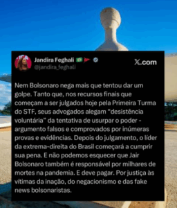 Nem Bolsonaro nega mais que tentou dar um golpe. Tanto que, nos recursos finais que começam a ser julgados hoje pela Primeira Turma do STF, seus advogados alegam “desistência voluntária” da tentativa de usurpar o poder – argumento falsos e comprovados por inúmeras provas e evidências. Depois do julgamento, o líder da extrema-direita do Brasil começará a cumprir sua pena. E não podemos esquecer que Jair Bolsonaro também é responsável por milhares de mortes na pandemia. E deve pagar. Por justiça às vítimas da inação, do negacionismo e das fake news bolsonaristas.
