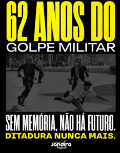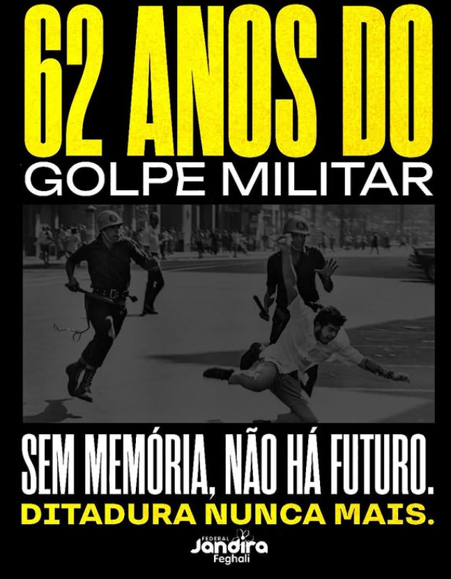 Sessenta e dois anos depois, a extrema direita golpista segue tentando sabotar a soberania popular para servir aos interesses das elites. Não aceitaremos o cinismo daqueles que exaltam o terror e conspiram contra a vontade do povo. Não aceitaremos conciliação com quem exalta torturador e trama contra a soberania das urnas. A democracia não se negocia com fascistas: exige-se justiça, punição e o fim da impunidade para quem atenta contra povo. Relembrar o horror de 1964 é gritar que não aceitaremos novos retrocessos. DITADURA NUNCA MAIS!