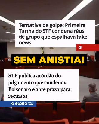 O STF publicou hoje o acórdão do julgamento de do golpista Jair Bolsonaro e seus cúmplices de organização criminosa: os generais Braga Netto, Augusto Heleno e Paulo Sérgio Nogueira, o almirante Almir Garnier, o ex-diretor da Abin Alexandre Ramagem, o ex-ministro da Justiça Anderson Torres e o tenente-coronel Mauro Cid. As defesas dos réus, já condenados, têm agora cinco dias para apresentar seus últimos recursos. Ontem, a primeira turma do STF também condenou outros sete réus por espalhar fake news que favoreceram a tentativa de golpe de Estado. A Justiça e a sociedade brasileira seguem juntas na luta contra quem ataca nossa democracia. Para que nunca mais se repita. Sem anistia!