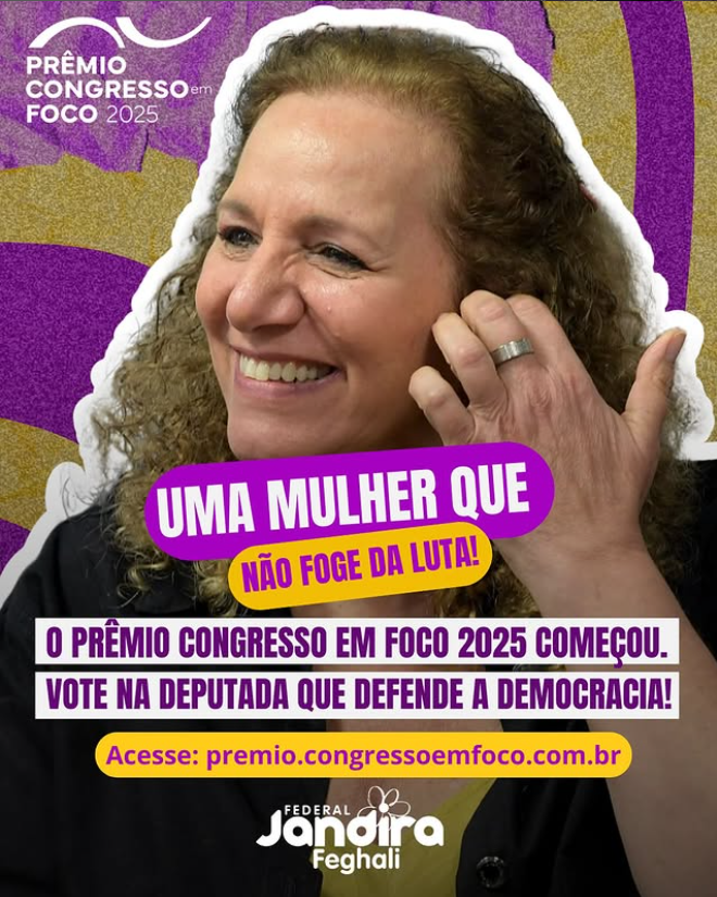 Em tempos de retrocessos e ameaças autoritárias, o Prêmio Congresso em Foco é também um gesto político: reconhecer quem luta do lado certo da história. Para votar em Jandira, acesse o site premio.congressoemfoco.com.br e participe!