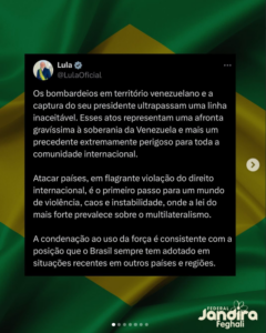 O presidente @lulaoficial condenou o ataque dos EUA à Venezuela e o sequestro de seu presidente, Nicolás Maduro. Lula alerta que esta violação do direito internacional torna o mundo mais violento e instável e é inaceitável. Líderes de países como Chile, Espanha, Cuba e Colômbia também alertam para o precedente perigoso aberto por Donald Trump ao agredir um país soberano. A comunidade internacional não pode se calar.