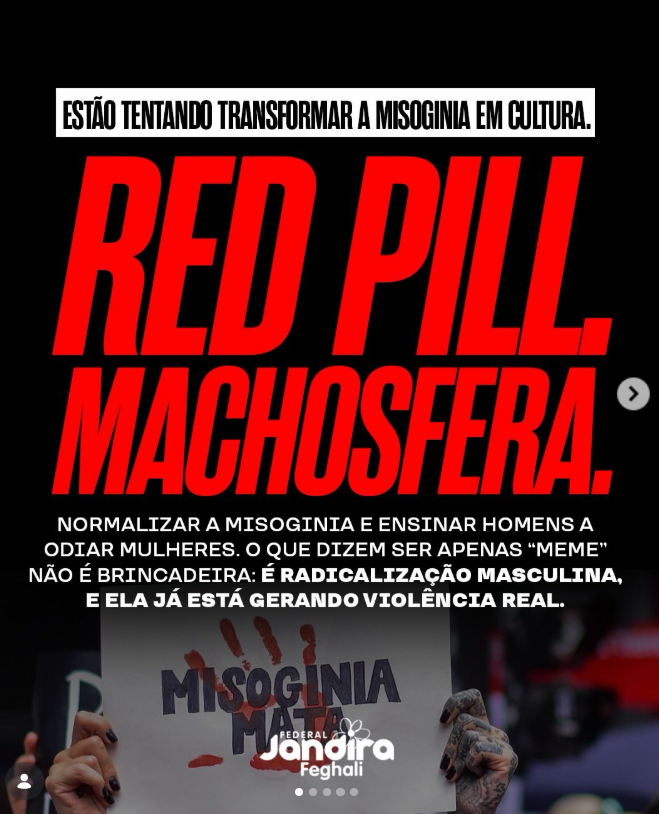 Um dado alarmante: 31% dos homens da geração Z dizem que mulheres devem obedecer ao marido. Isso não é apenas “conservadorismo”. É o resultado de uma cultura digital que normaliza misoginia, radicaliza jovens e transforma o ódio contra mulheres em produto de engajamento. A chamada machosfera – com Red Pill, incels e influenciadores antifeministas – cresce nas redes sociais e alcança milhões de jovens. Enquanto isso, mulheres seguem sendo vítimas de violência física, simbólica e digital. É preciso combater com firmeza essa ira digital e responsabilizar esse movimento criminoso. Combater a misoginia também é defender democracia, direitos humanos e igualdade.