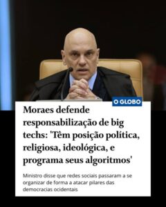 O ministro Alexandre de Moraes alerta: as big techs estão atacando os pilares da democracia. A cada dia, fica mais evidente que os algoritmos de suas redes são programados de acordo com os interesses privados de seus acionistas e investidores. Apenas a força da lei pode frear o ímpeto colonialista de bilionários como Musk, Zuckerberg e Sam Altman. A regulação das redes é urgente na defesa da democracia!