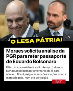 Alexandre de Moraes age corretamente ao pedir a análise da PGR para reter o passaporte de Eduardo Bolsonaro, que está nos EUA conspirando contra o Brasil. Enquanto seu pai se vê cada vez mais próximo da cadeia, Eduardo atua abertamente para enfraquecer a soberania nacional, pedindo sanções e interferências externas. Trata-se de um movimento desesperado e criminoso, típico de quem não tem compromisso com a democracia, mas sim com a própria impunidade. Traição ao país não pode ser tolerada. Sem anistia!