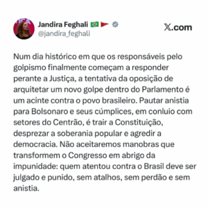 GRAVE! Num dia histórico em que os responsáveis pelo golpismo finalmente começam a responder perante a Justiça, a tentativa da oposição de arquitetar um novo golpe dentro do Parlamento é um acinte contra o povo brasileiro. Pautar anistia para Bolsonaro e seus cúmplices, em conluio com setores do Centrão, é trair a Constituição, desprezar a soberania popular e agredir a democracia. Não aceitaremos manobras que transformem o Congresso em abrigo da impunidade: quem atentou contra o Brasil deve ser julgado e punido, sem atalhos, sem perdão e sem anistia.