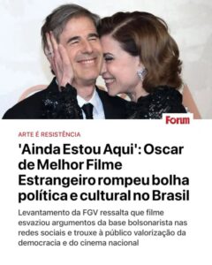 Um novo estudo da FGV confirma o poder da Cultura para fazer do Brasil um país melhor. Nas redes, o filme “Ainda Estou Aqui” rompeu a bolha política, gerou sentimentos de orgulho por nosso cinema e festejou a identidade brasileira perante o mundo. A extrema direita bolsonarista, sempre disposta a atacar a arte, ficou sem argumentos diante dessa onda de celebração e se calou após a vitória no Oscar. É pela força da Cultura que vamos criar um Brasil mais justo, soberano, democrático e unido.