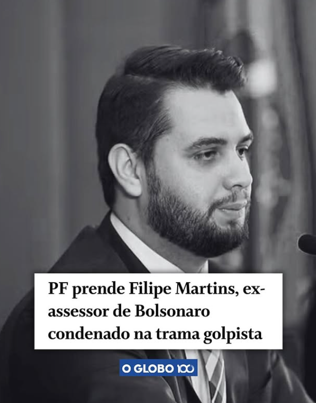 A Polícia Federal prendeu hoje o ex-assessor de Jair Bolsonaro Filipe Martins (aquele dos gestos supremacistas e da minuta golpista), condenado pela tentativa de golpe. Ele estava em prisão domiciliar enquanto sua defesa recorre da decisão judicial, mas desobedeceu medida restritiva ao usar redes sociais. O STF, então, decretou a prisão preventiva. Em 2026, seguimos firmes na luta contra os golpistas. Sem anistia!