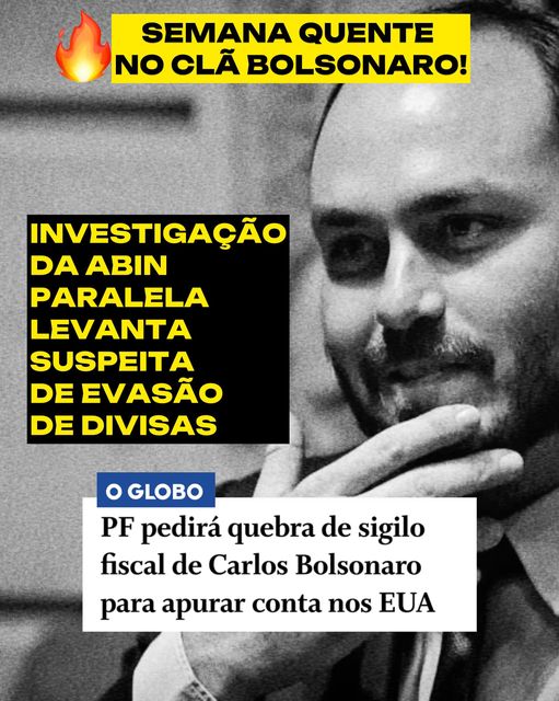 EVASÃO DE DIVISAS? A semana não começou bem para o clã Bolsonaro. A investigação da ABIN paralela segue rendendo frutos! Agora, a Polícia Federal vai pedir a quebra do sigilo fiscal de Carlos Bolsonaro para verificar se ele manteve uma conta bancária nos Estados Unidos. Os dados de possível existência de conta estão no inquérito que apura monitoramentos ilegais da Agência. Um documento traria uma carta escrita por Carluxo, em inglês, à instituição financeira Truist Bank, na Flórida, aonde pede ajuda para receber um cheque emitido pelo banco quando sua conta foi encerrada, em setembro de 2023, e agradece “pelo ótimo atendimento e toda atenção que recebeu quando era cliente”. A PF quer averiguar se a conta atribuída ao vereador no exterior era declarada por ele. Quanto mais mexe, pior fica!