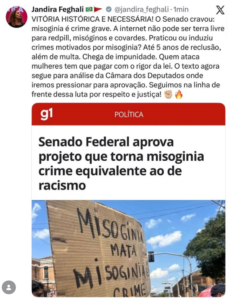 VITÓRIA HISTÓRICA E NECESSÁRIA! O Senado cravou: misoginia é crime grave. A internet não pode ser terra livre para redpill, misóginos e covardes. Praticou ou induziu crimes motivados por misoginia? Até 5 anos de reclusão, além de multa. Chega de impunidade. Quem ataca mulheres tem que pagar com o rigor da lei. O texto agora segue para análise da Câmara dos Deputados onde iremos pressionar para aprovação. Seguimos na linha de frente dessa luta por respeito e justiça! ✊🏼🔥