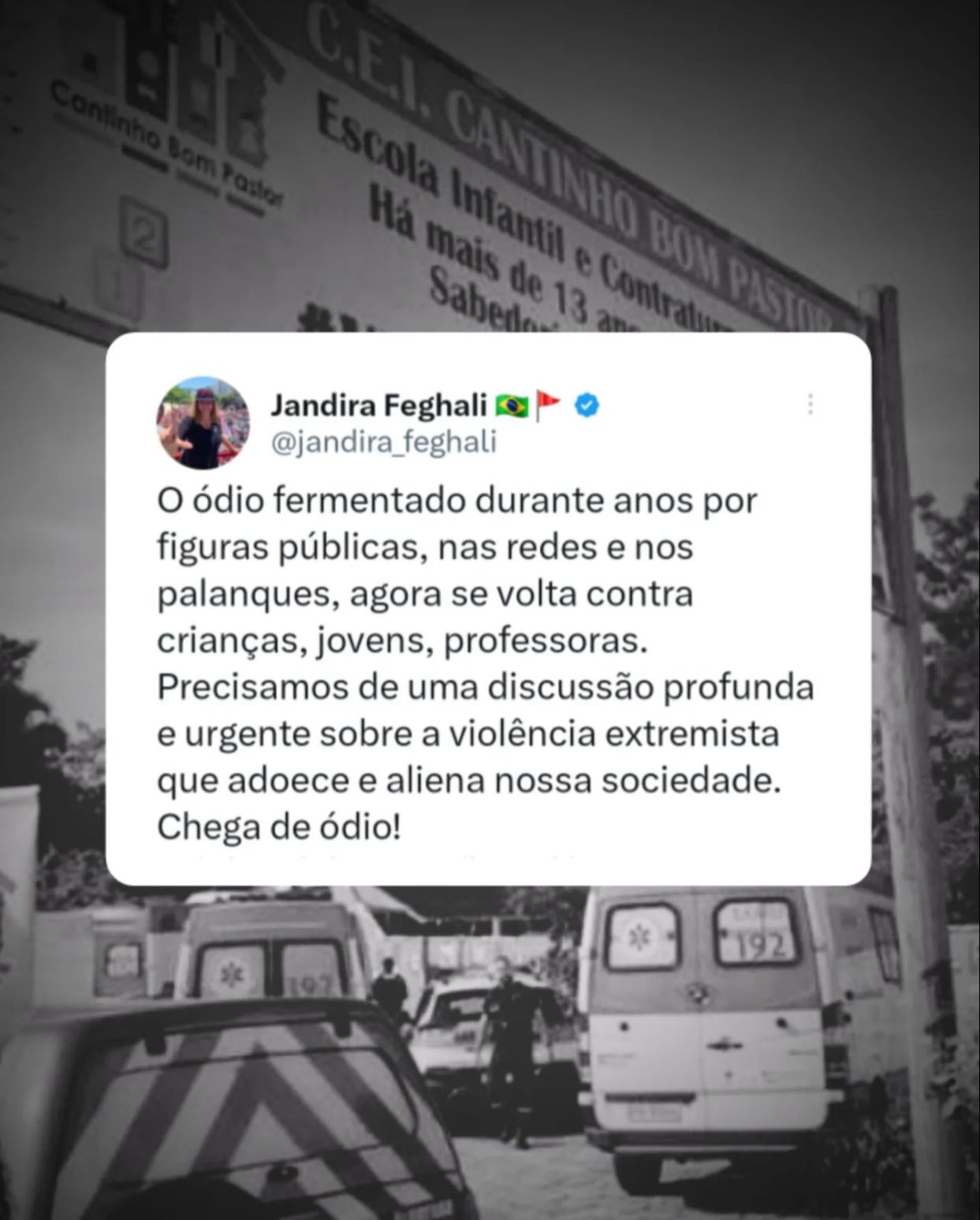 Depois de um dia inteiro acompanhando, estarrecida, as notícias tenebrosas de Blumenau, quero me solidarizar como mãe às familias das quatro crianças indefesas que foram vítimas do ódio plantado nas redes.
