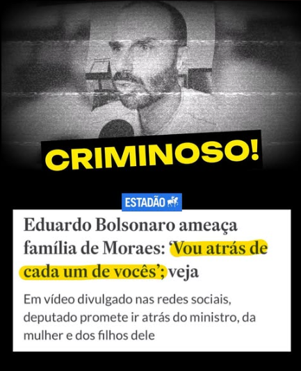 O traidor da pátria Eduardo Bolsonaro continua a produzir provas contra si mesmo. No pior estilo “vilão de HQ”, agora ameaça diretamente os familiares do ministro Alexandre de Moraes e diz que irá “atrás de cada um de vocês”. Já passou da hora de cassar o mandato deste mau brasileiro. E que responda por seus crimes na Justiça como seu pai, o golpista Jair Bolsonaro.