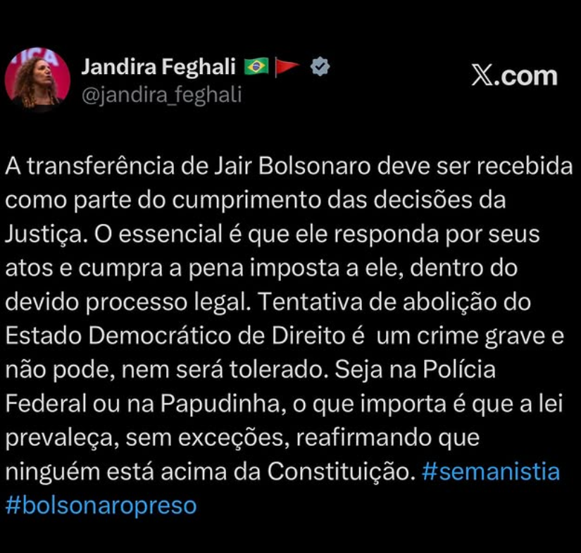 A transferência de Jair Bolsonaro deve ser recebida como parte do cumprimento das decisões da Justiça. O essencial é que ele responda por seus atos e cumpra a pena imposta a ele, dentro do devido processo legal. Tentativa de abolição do Estado Democrático de Direito é um crime grave e não pode, nem será tolerado. Seja na Polícia Federal ou na Papudinha, o que importa é que a lei prevaleça, sem exceções, reafirmando que ninguém está acima da Constituição.