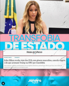 É revoltante ver o governo Trump, mais uma vez, atacar a dignidade de uma mulher trans. Não se trata de erro, mas de transfobia institucional, sustentada por um projeto político que apaga existências e alimenta o ódio. Minha solidariedade à deputada Erika Hilton. Não vamos nos calar diante desse ataque. Trump não é o rei do mundo e não vai impor sua visão discriminatória sobre nós.