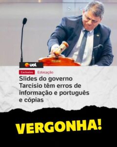 Pode ser um meme de 1 pessoa e texto que diz “uol Exclusivo Educação Slides do governo Tarcísio têm erros de informação e português e cópias VERGONHA!”